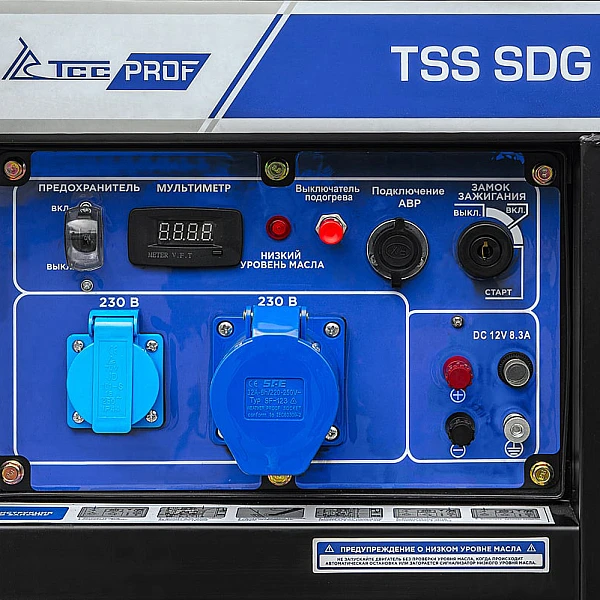 Встроенные в TSS SDG 7000EHA электронные системы обеспечивают высокую стабильность тока и защиту как электростанции, так и подключенной нагрузки от опасных ситуаций, таких как короткое замыкание или перегрузка. Предусмотрена индикация низкого уровня масла, которая помогает избежать запуска двигателя на сухую.