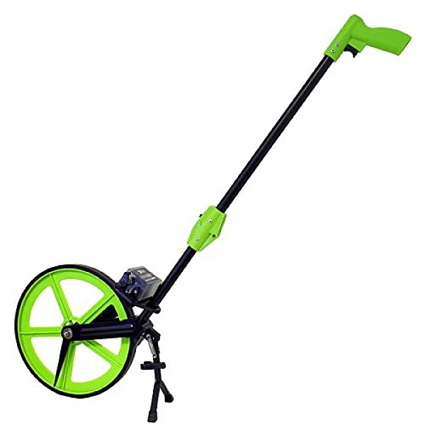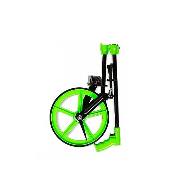 Рабочее измерительное колесо имеет резиновый обод и пластиковые спицы. Это позволяет уменьшить вес инструмента и обеспечить его комфортное перемещение по твердым поверхностям. Для удобного перемещения приспособления предусмотрена складная штанга с рукояткой. В верхней части закреплена клавиша тормоза, позволяя остановить колесо в точном месте окончания замера.