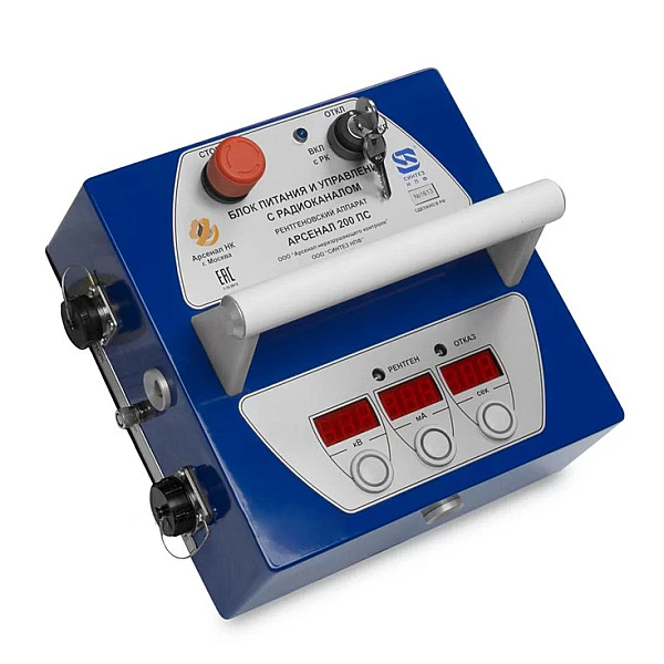 Работой генерирующего блока АРСЕНАЛ 200 управляет выносной пульт управления (БПУ РК — блок питания и управления), который подключается к генератору с помощью высоковольтного кабеля. Электронная схема БПУ-РК осуществляет стабилизацию установленных значений тока и напряжения на аноде трубки, управляет таймером экспозиции, генерирует сигналы предупреждения и защиты, необходимые для безопасной эксплуатации прибора.