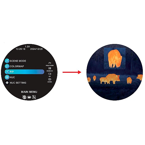 Главная особенность модели — система AI-апскейлинга, которая программно повышает разрешение изображения, улучшая детализацию и чёткость. Высокочувствительный сенсор фиксирует температурные различия до 0.04°C, что позволяет уверенно обнаруживать тепловые объекты в полной темноте, тумане и осадках. Дальность обнаружения человека достигает 1100 метров.