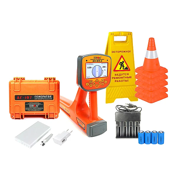 Комплект оснащен новейшим компактным автономным генератором АГ-107 со встроенными элементами питания, дисплеем и встроенной индукционной антенной, для трассировки коммуникации бесконтактным способом.